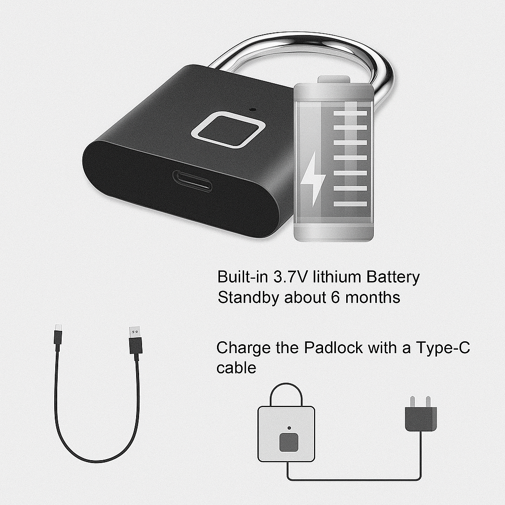 tay secure without worrying about battery life. The Smart Fingerprint Padlock is powered by a built-in 3.7V lithium battery that lasts up to 6 months on standby. When it needs a boost, simply recharge it with a Type-C cable—quick, easy, and eco-friendly. Perfect for daily use, whether you’re traveling, at the gym, or securing personal items.